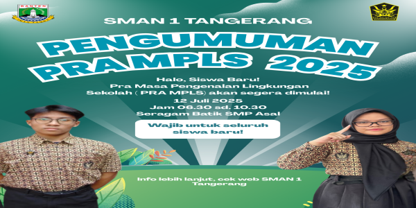 Diberitahukan kepada seluruh siswa baru yang telah diterima di SMAN 1 Tangerang Tahun Pelajaran 2025/2026, bahwa kegiatan Pra MPLS (Masa Pengenalan Lingkungan Sekolah) akan dilaksanakan pada: